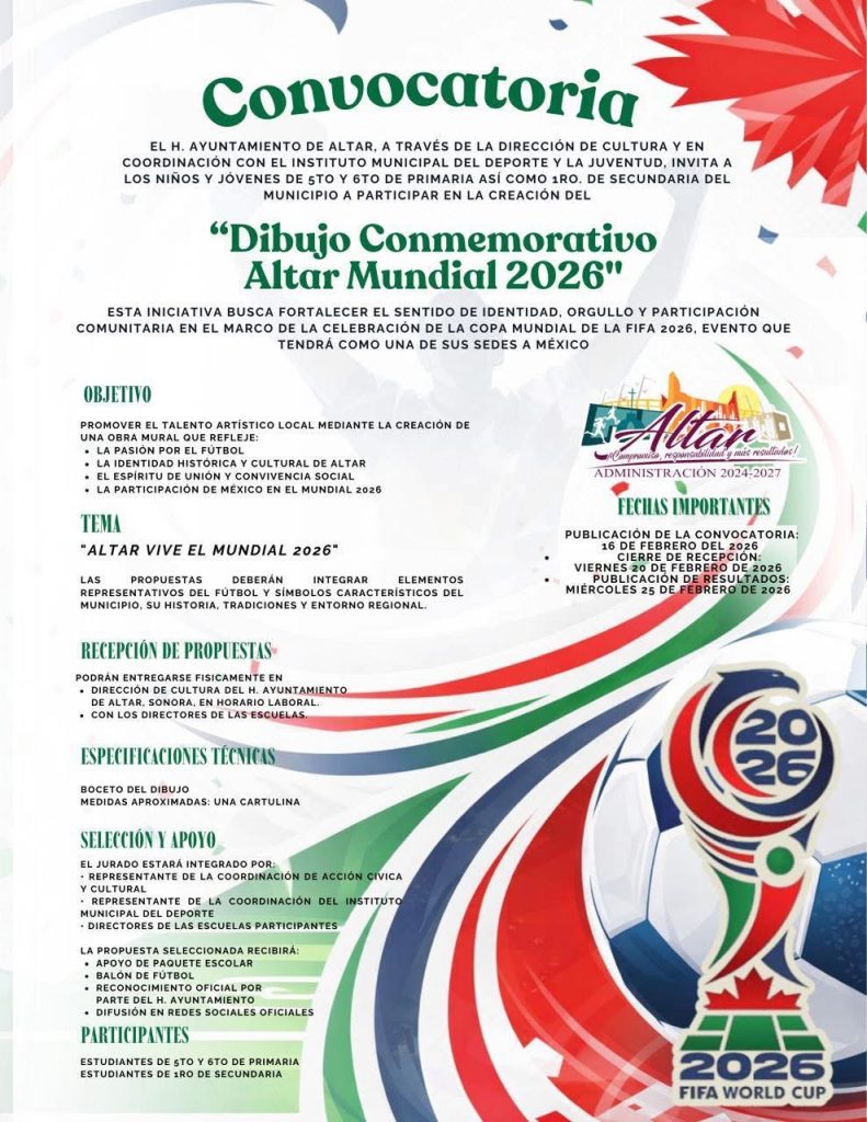 ⚽️CONVOCATORIA⚽️ El H. Ayuntamiento de Altar, a través de la Dirección de Cultura y en coordinación con el Instituto Municipal del Deporte y la Juventud , invita los niños y jóvenes de 5to y 6to de Primaria; así como 1ro. de Secundaria del municipio a participar en la creación del “Dibujo Conmemorativo Altar Mundial 2026”