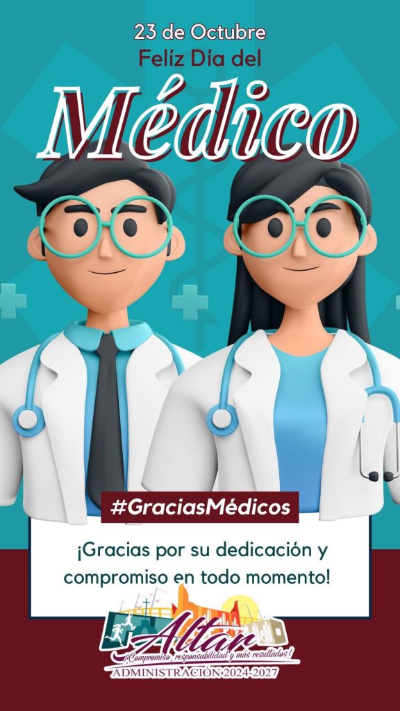 👩⚕️👨⚕️ ¡Feliz Día del Médico! El H. Ayuntamiento de Altar y DIF Municipal reconocen y felicitan a todas y todos los médicos por su invaluable labor, entrega y compromiso con la salud y el bienestar de nuestras familias altarenses. ❤️ ¡Gracias por cuidar con vocación y humanidad a nuestra comunidad!