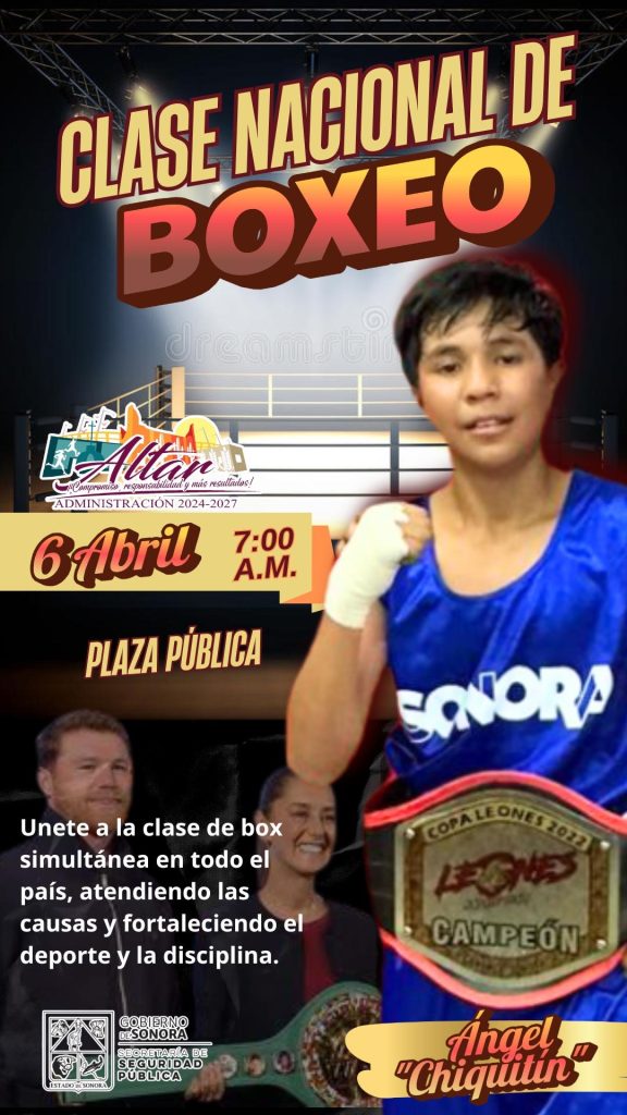 El Gobierno de México, a travez de la SSP Sonora y el H. Ayuntamiento de Altar, invitan a la “Clase Nacional de Boxeo” Que se llevará a cabo simultáneamente en nuestro país el próximo 6 de abril a las 7:00 a.m. En la Plaza Pública de nuestro municipio. Te esperamos, ponte ropa cómoda y disfruta […]