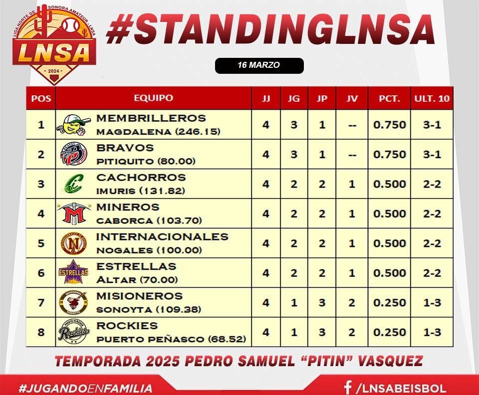Les compartimos las posiciones al terminar dos jornadas de la LNSA ⚾️ Los Membrilleros de Magdalena (3-1) se colocaron en lo más alto del standing después de llevarse la serie por limpia en su visita a los Estrellas de Altar (2-2) que cayeron a la sexta posición. Los Bravos de Pitiquito (3-1) escalaron al […]