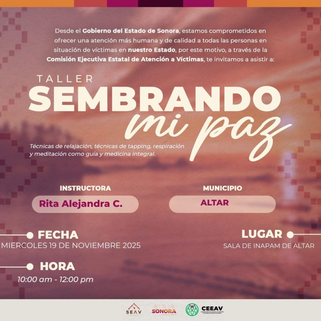 DIF ALTAR en coordinación con el Instituto Municipal de la Mujer, llevará a cabo el taller dirigido a personas adultas mayores, bajo el tema “Sembrando mi Paz”. Una actividad pensada para fortalecer su bienestar emocional y crear espacios de tranquilidad y reflexión.