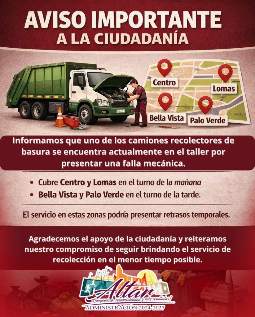 ⚠️ Aviso a la comunidad ⚠️ El recolector de basura continúa en reparación. Aunque se puso en circulación el fin de semana, la falla persiste. Agradecemos su comprensión y paciencia.