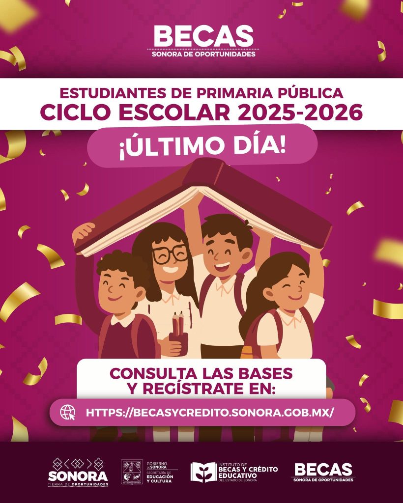 📢 ¡Atención madres y padres de familia! Hoy es el último día para registrar a tu hija o hijo que cursa primaria pública en el programa de becas más grande en la historia de la entidad. Entra a ➡ becasycredito.sonora.gob.mx, acude a nuestras instalaciones o ubica tu brigada más cercana y ¡haz tu registro!
