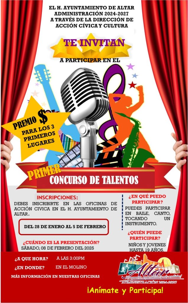 El H. Ayuntamiento de Altar, a través de la Dirección de Acción y Cultura, te invita a participar en el Primer Concurso de Talentos. ✴️ #Categorías: •Baile💃🏻🕺🏻 •Canto🎙️ •Tocando un instrumento 🎸 🎹 🎺 🎻 ✴️ #Edad: Niños y jóvenes hasta los 18 años. ✴️ #Premios: Se entregará un Premio 💰Económico a los #TRES primeros […]