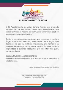 🔶El H. Ayuntamiento de Altar, Sonora, que preside el Alcalde Lic. Luis Angel Valenzuela Mendivil, felicita con profundo orgullo a la Dra. Ana Luisa Chávez Haro, seleccionada para recibir la Presea al Poderío de las Mujeres Sonorenses 2025 en la categoría de Ámbito Jurídico.