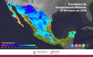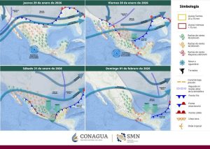 Por su parte, durante de mañana, viernes 30 de enero un nuevo frente frió sé aproximará al noroeste del país originando rachas de vientos fuertes sobre el norte y noroeste de Sonora y un reforzamiento en el descenso de temperaturas. Dicho sistema mantiene probabilidad de lluvias de muy bajas a nulas.