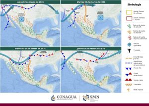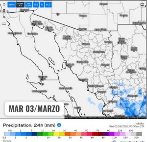 Por su parte, se pronóstica que un nuevo sistema invernal ingrese al estado de Sonora entre los días viernes 06 y sábado 07 de marzo impulsando inestabilidad suficiente para la generación de tormentas aisladas durante el fin de semana en gran parte del territorio. A su vez, estás condiciones se mantendrán los próximos 3 días posteriores al ingreso con efectos como un descenso marcado en las temperaturas, rachas de viento y posible caída de granizo.