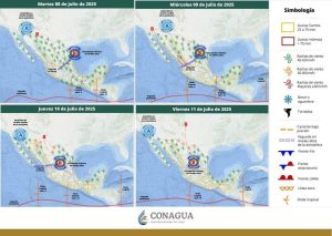 Por su parte, el *patrón de circulación tipo monzón* sobre el noroeste de México, originará chubascos y lluvias fuertes a muy fuertes acompañadas con descargas eléctricas y posible caída de granizo durante horario vespertino sobre municipios del oriente.