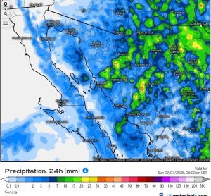 A su vez, los efectos del *monzón mexicano* en interacción con divergencia y con la humedad aportada por el ciclón tropical “Lorena” ocasionarán tormentas eléctricas con lluvias de fuertes a muy fuertes (25 a 75mm) y fuertes rachas de viento (+60 km/h) sobre el oriente, sur, norte, nororiente, y centro en horario vespertino.