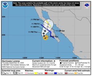 Continua en vigilancia el *ciclón tropical “Lorena”* el cuál se espera que continue su desplazamiento paralelo a la costa de Baja California Sur y al internarse a condiciones poco favorables comience a perder fuerza. No obstante, sus bandas nubosas aportarán bastante humedad al estado de Sonora originando *lluvias de fuertes a muy fuertes* en todo el territorio Sonorense en el periodo que comprende los días 04 al 07 de septiembre. A su vez, generará *rachas de viento fuertes (+60 km/h)* y *oleaje de 2.5 a 3 metros de altura* sobre las costas del sur de Sonora durante el día viernes.