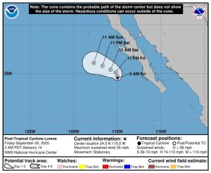Continua en vigilancia el *ciclón tropical “Lorena”* ahora como ciclón post-tropical el cuál se espera que continue su desplazamiento al internarse a aguas del Pacifico donde las condiciones poco favorables comiencen a perder fuerza y de disipe. No obstante, sus bandas nubosas aportarán bastante humedad al estado de Sonora originando *lluvias de fuertes a muy fuertes* en todo el territorio Sonorense durante hoy. A su vez, generará *rachas de viento fuertes (+60 km/h)* y *oleaje de 2.5 a 3 metros de altura* sobre las costas del sur de Sonora durante el día viernes.