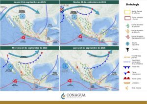 Por otro lado, un nuevo *frente frío* se aproximará sobre la frontera noroeste del país durante los días 25 y 26 de septiembre ocasionando, fuertes rachas de viento y un descenso ligero en las temperaturas en el estado de Sonora.