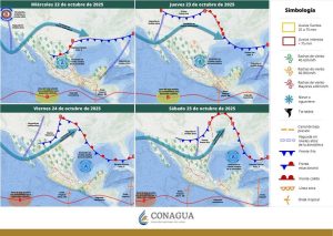 Por otro lado, se prevé la aproximación de dos nuevos frentes fríos durante el 24 y 28 de octubre, generando un descenso en las temperaturas, así como rachas de viento moderadas en el noroeste del estado.