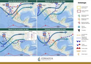 Finalmente, un nuevo frente frío se aproximará e ingresará al noroeste de México durante el día viernes 21, se asociará con una vaguada polar y las corrientes en chorro polar y subtropical, ocasionando descenso de temperatura, vientos fuertes, lluvias y chubascos en dicha región. A su vez, se prevé posible caída de nieve o aguanieve sobre la sierra, reforzando las condiciones anteriores.
