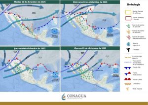 Por su parte, un nuevo *frente frío* se aproximará sobre la frontera norte de Sonora durante el día 04 de diciembre ocasionando un marcado *descenso de temperaturas*, *lluvias de ligeras a moderadas*, *rachas de viento fuertes* y la probabilidad de caída de nieve y aguanieve sobre la región montañosa.