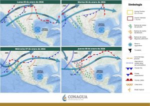 Durante hoy, *la corriente en chorro subtropical* y la *corriente en chorro polar* estarán originando cielos parcialmente nublados sin probabilidad de lluvia sobre la mayor parte del estado. Simultáneamente, un nuevo frente frío se aproximará al noroeste del país, el cual, se prevé se aproxime e ingrese al territorio estatal durante el día miércoles 07 de enero ocasionando *lluvias de ligeras a moderadas (0.5 a 25mm)* sobre las regiones del centro, oriente y norte. A su vez, un descenso en las temperaturas con valores mínimos que oscilen entre los -5 a los 0°C sobre la zona montañosa de Sonora. Por su parte, el ingreso de dicho sistema originará rachas de viento de moderadas a fuertes sobre el oriente y noreste durante su paso. También, mantiene la probabilidad de caída de nieve/aguanieve sobre municipios limítrofes con Chihuahua.