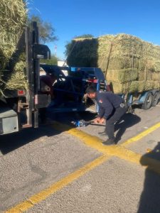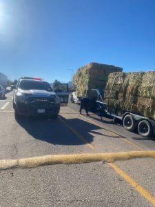 El vehículo, que transportaba pacas de alfalfa, sufrió el desprendimiento de la batanga, provocando que la carga cayera sobre la cinta asfáltica.