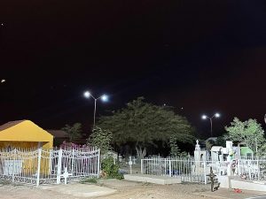 Atendiendo la indicación del alcalde Luis Angel Valenzuela Mendivil de mantener en óptimas condiciones el panteón municipal y sus zonas aledañas para este festejo del Día de Muertos, se llevó a cabo la rehabilitación de 17 lámparas de alumbrado público, tanto en el interior como en el exterior del lugar.