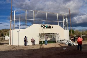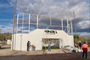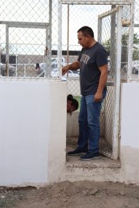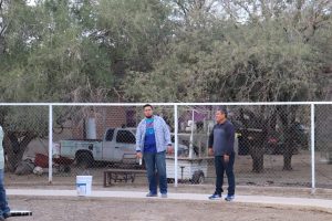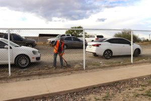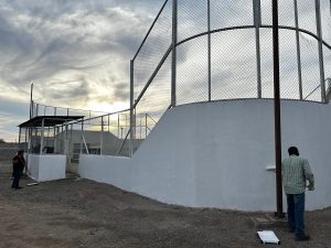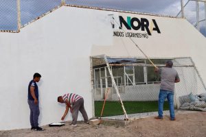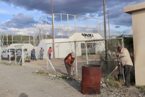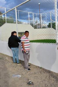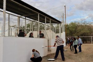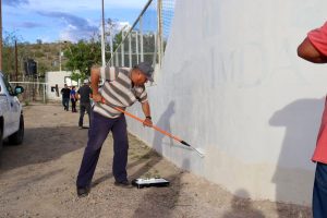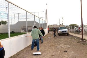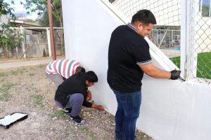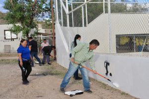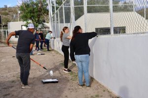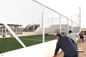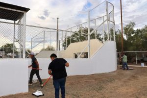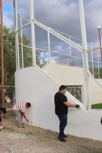 Continuando con la rehabilitación de la cancha de fútbol rápido de la colonia La Otra Banda, la tarde de este martes el Presidente Municipal Luis Angel Valenzuela Mendivil, acompañado de funcionarios públicos, realizó trabajos de pintado en la estructura de la jaula, así como una limpieza general del área, con el apoyo del personal de Servicios Públicos.